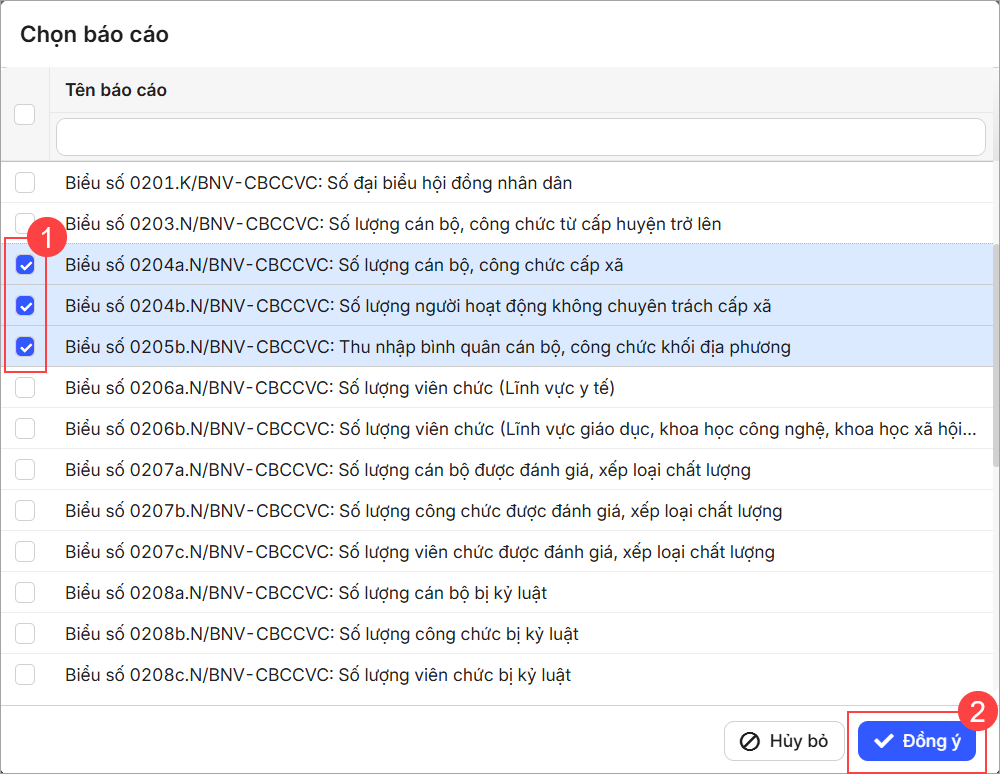 - Tích chọn báo cáo được cấp chủ quản yêu cầu, nhấn Đồng ý.