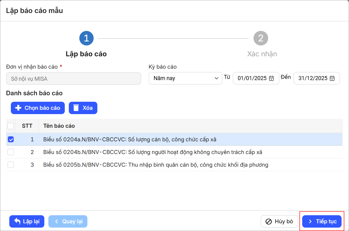 Đồng thời, có thể tích chọn Tổng hợp báo cáo của chính đơn vị hay không. - Nhấn Tiếp tục để chuyển sang bước Xác nhận. Nhấn Lập & Gửi để lập và gửi báo cáo cho cấp trên.