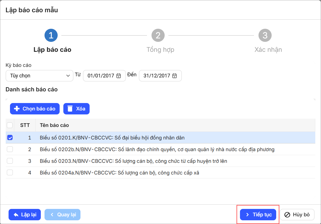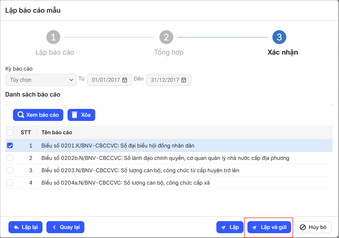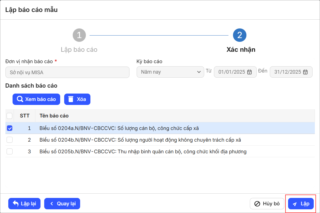 - Anh/chị có thể Xem báo cáo đã chọn, nhấn Lập để lưu.
