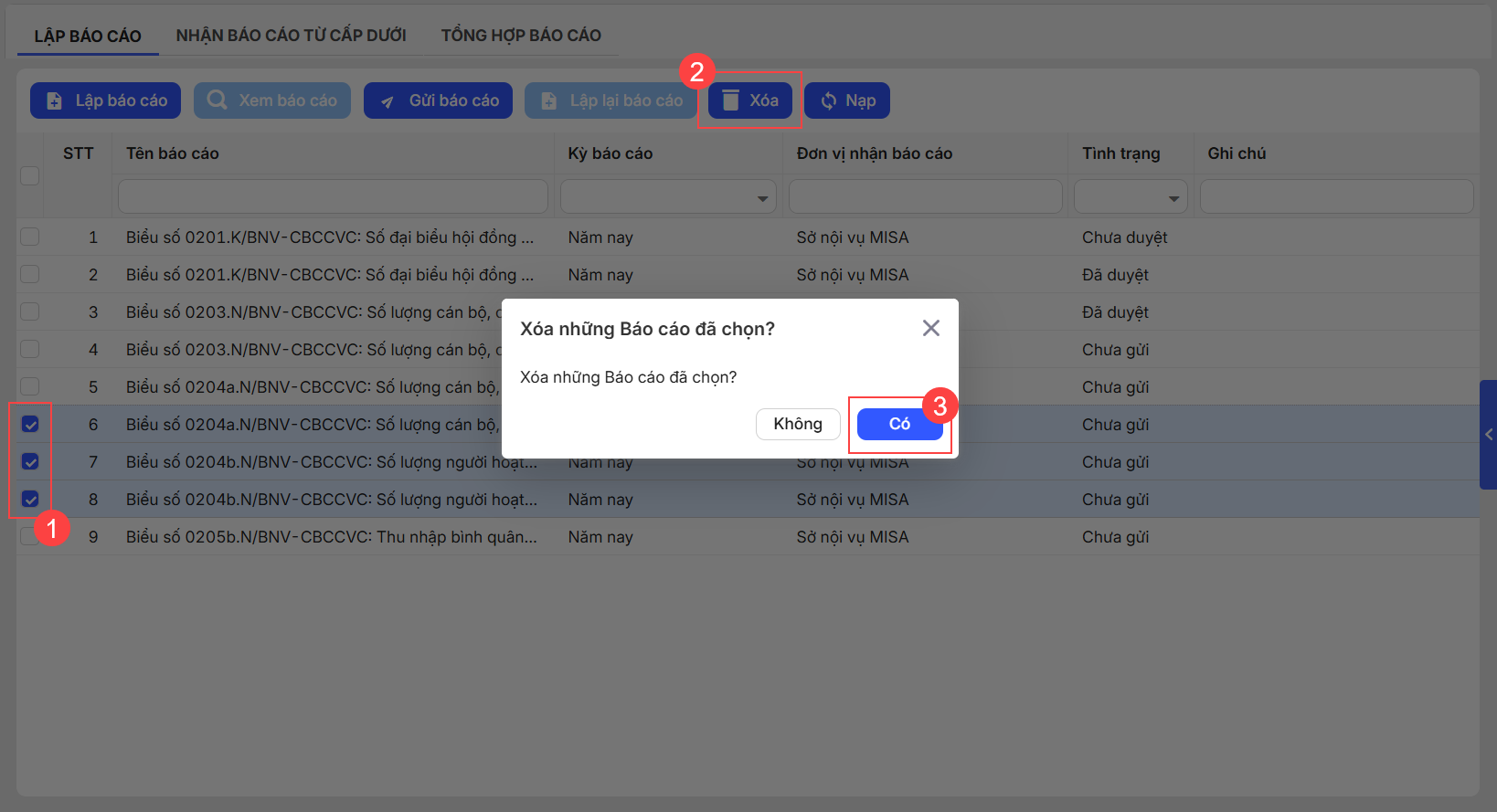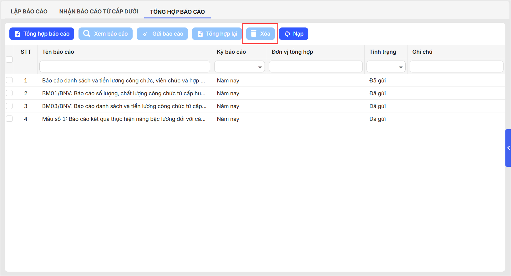- Nếu muốn xóa các báo cáo có trạng thái Chưa gửi, chọn báo cáo và nhấn Xóa.