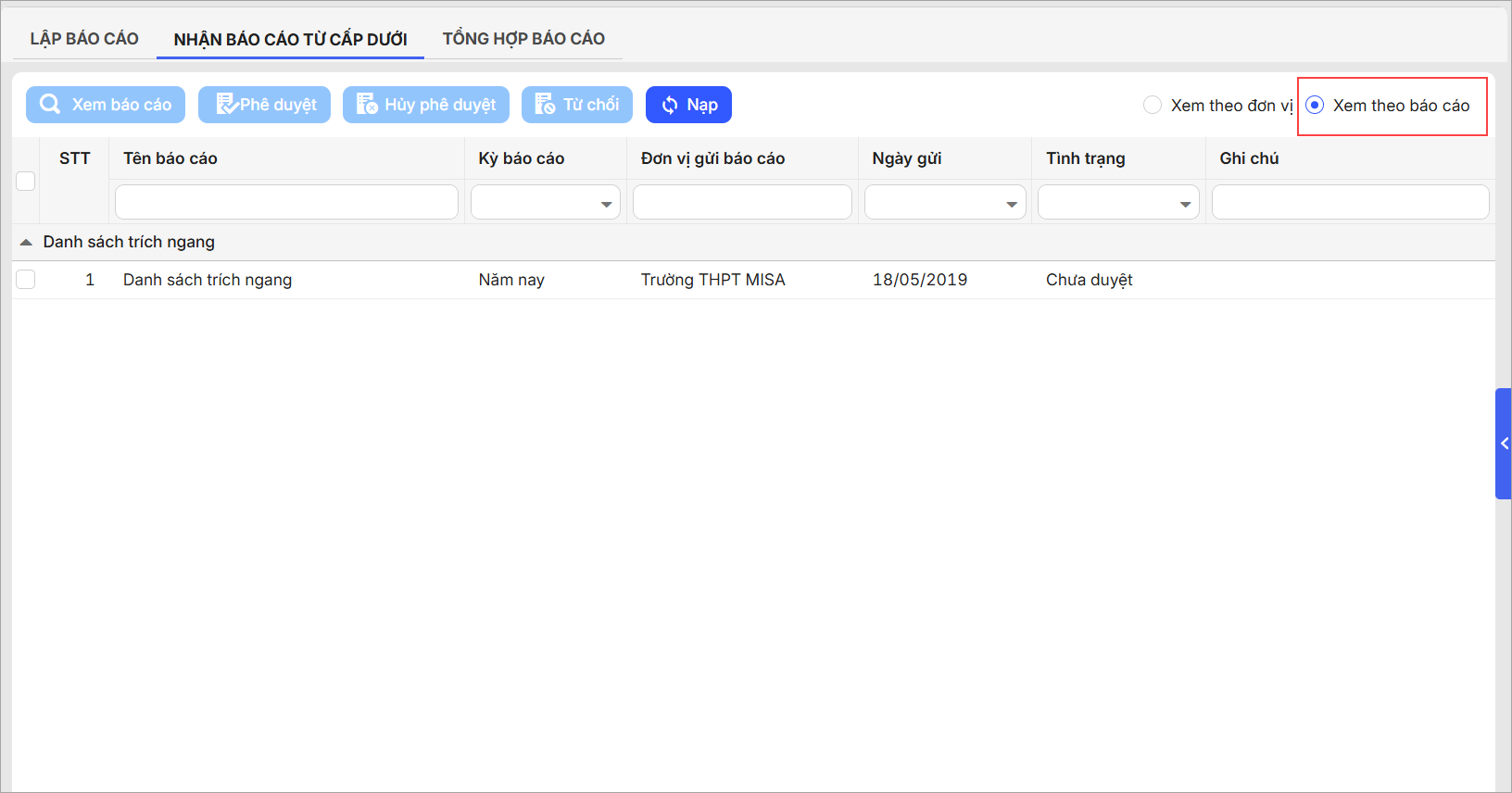 Các báo cáo sau khi phê duyệt sẽ có trạng thái là Đã duyệt. Đơn vị cấp dưới có thể xem được tình trạng báo cáo là Đã duyệt hay chưa.