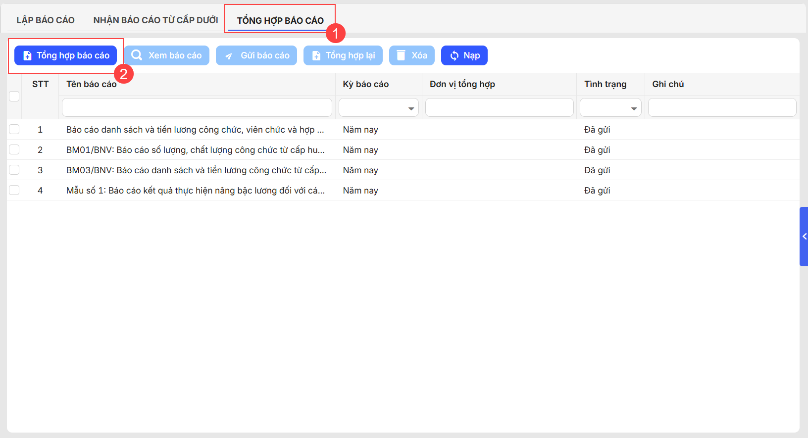 - Với những đơn vị có trạng đã Nộp đủ báo cáo, CBTC tích chọn các đơn vị muốn tổng hợp báo cáo.