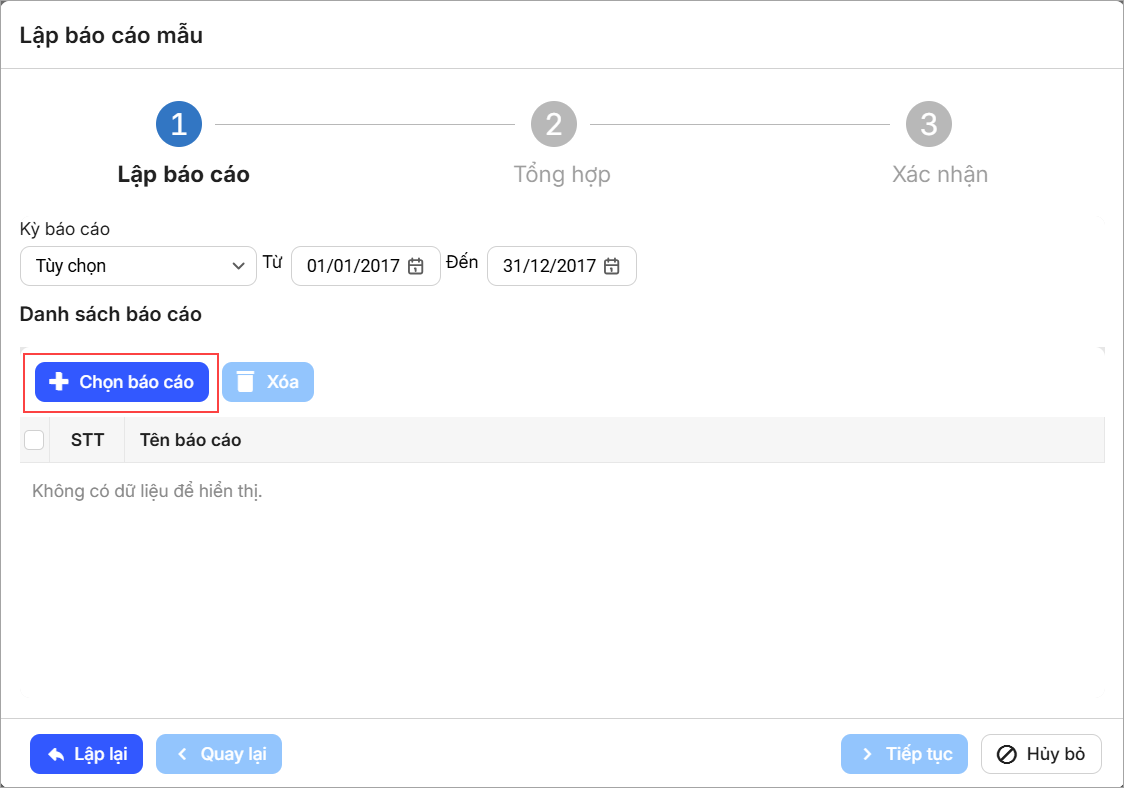- Để lập báo cáo mẫu, chọn Lập báo cáo.