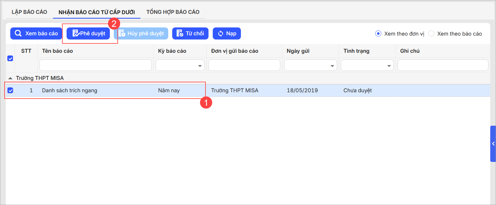 - Với báo cáo đã đạt điều kiện, tích chọn và nhấn Phê duyệt.
