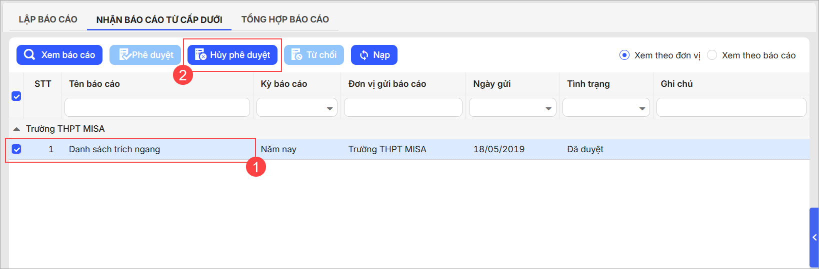 - Để hủy phê duyệt báo cáo, chọn báo cáo tương ứng, nhấn Hủy phê duyệt.