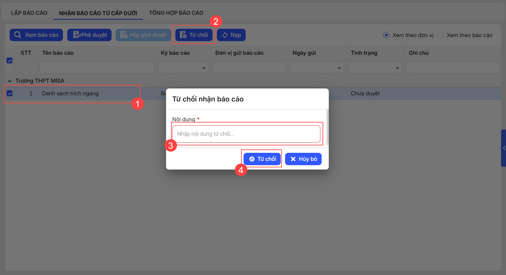 Các báo cáo sau khi hủy phê duyệt sẽ có trạng thái là Chưa duyệt. - Trường hợp báo cáo chưa hợp lệ, tích chọn các báo cáo, nhấn Từ chối. Nhập Lý do từ chối và xác nhận Từ chối.