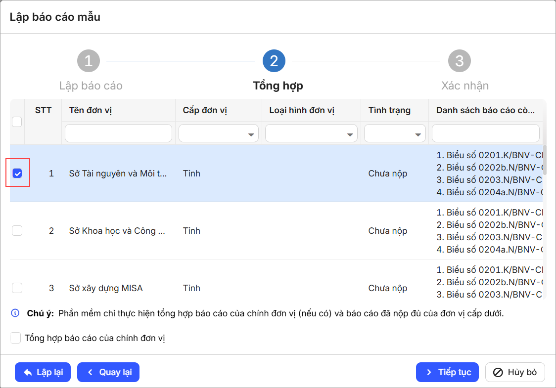 - Với những đơn vị có trạng đã Nộp đủ báo cáo, CBTC tích chọn các đơn vị muốn tổng hợp báo cáo.