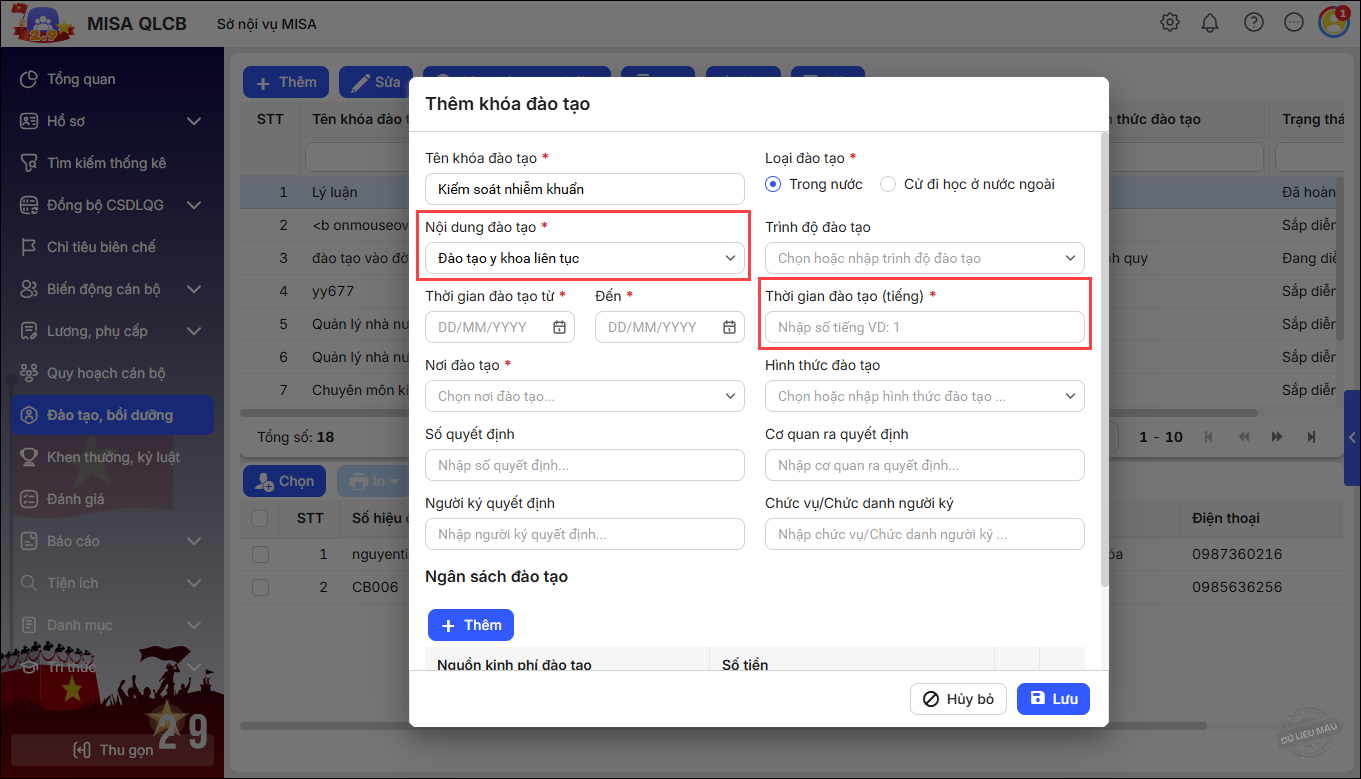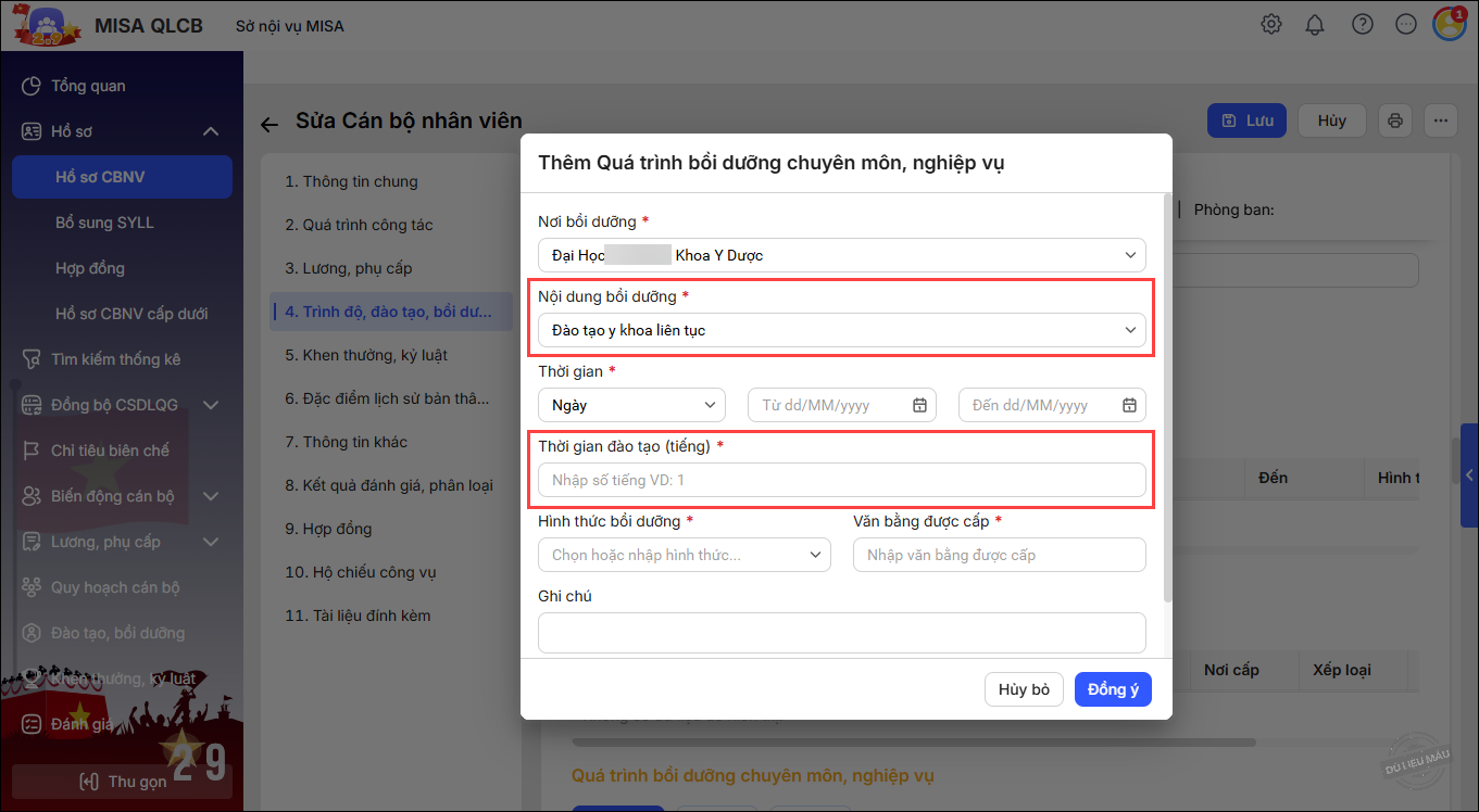 2. Tại màn hình Hồ sơ\Hồ sơ CBNV, khi Thêm hoặc Sửa Quá trình bồi dưỡng chuyên môn, nghiệp vụ của CBNV, chọn Nội dung bồi dưỡng là Đào tạo y khoa liên tục. Khi chọn nội dung này thì phần mềm bổ sung thêm thông tin Thời gian đào tạo để khai báo.