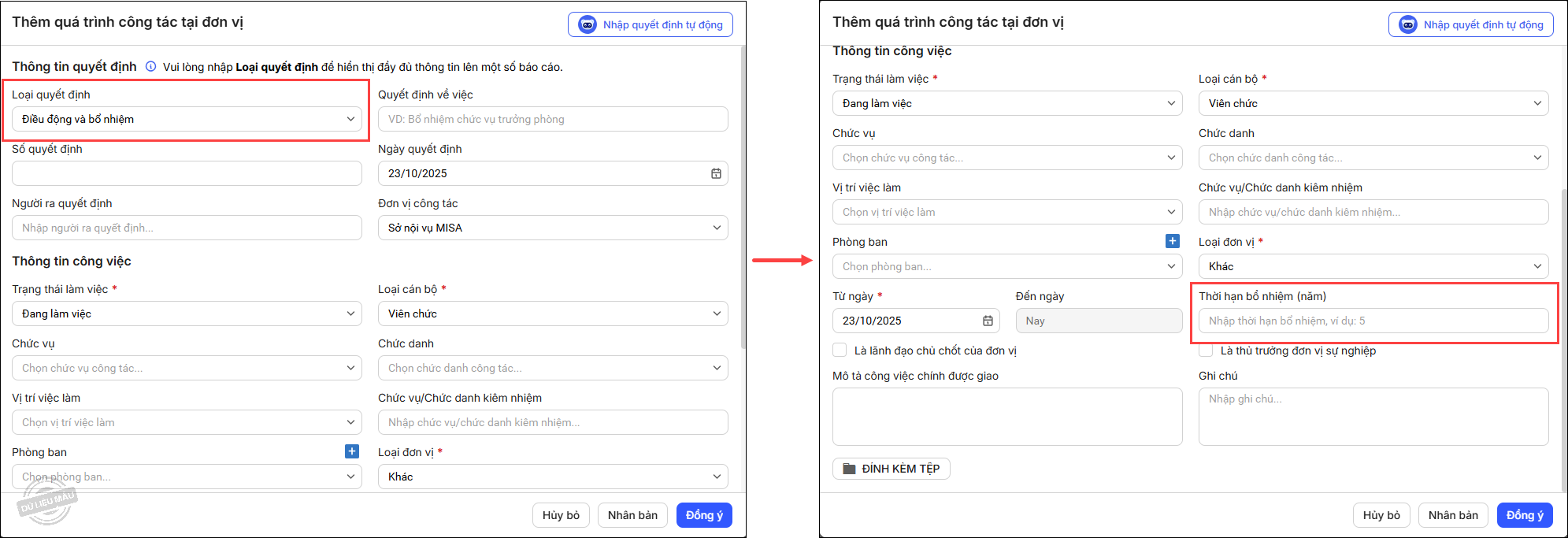 – Tại màn hình Hồ sơ\Hồ sơ CBNV\Thêm CBNV, khi khai báo quá trình công tác chọn Loại quyết định là Điều động và bổ nhiệm, phần mềm bổ sung thông tin Thời hạn bổ nhiệm (năm).