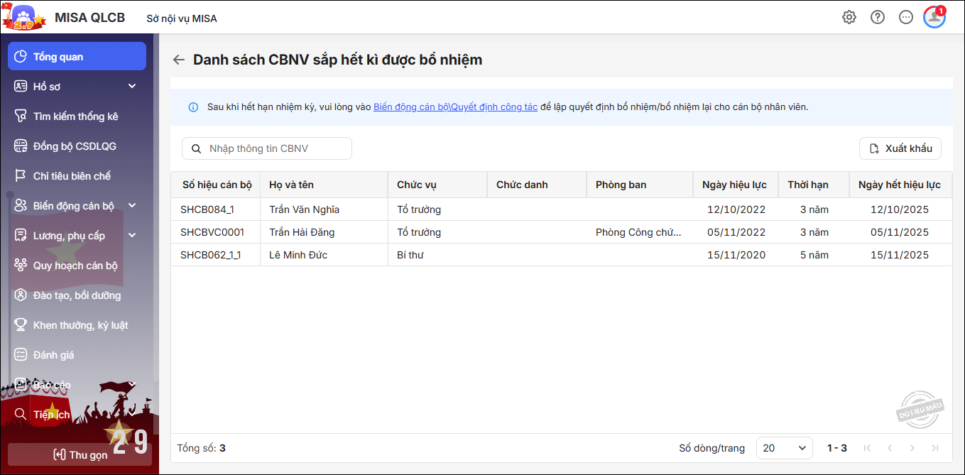 Cán bộ tổ chức (CBTC) có thể nắm bắt danh sách CBNV sắp hết kỳ bổ nhiệm sau khi phát sinh quyết định điều động và bổ nhiệm.