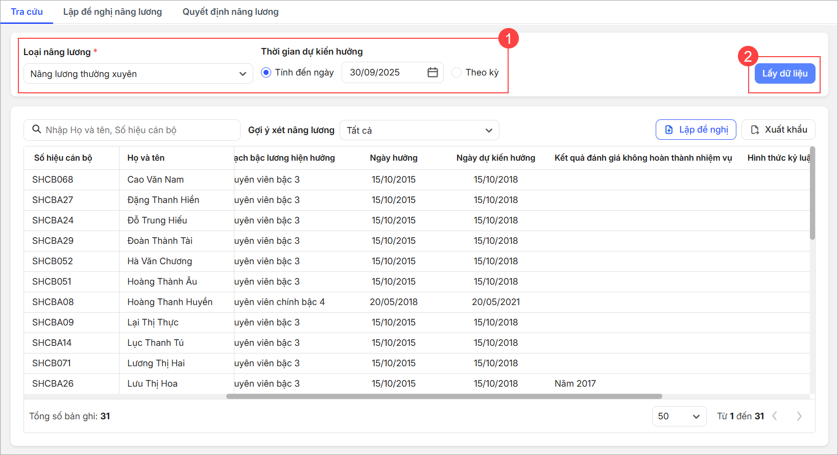 • Chọn loại nâng lương và thời gian dự kiến nâng lương, nhấn Lấy dữ liệu.