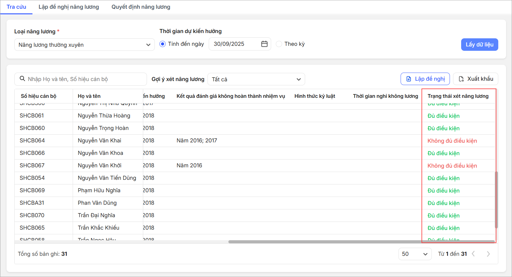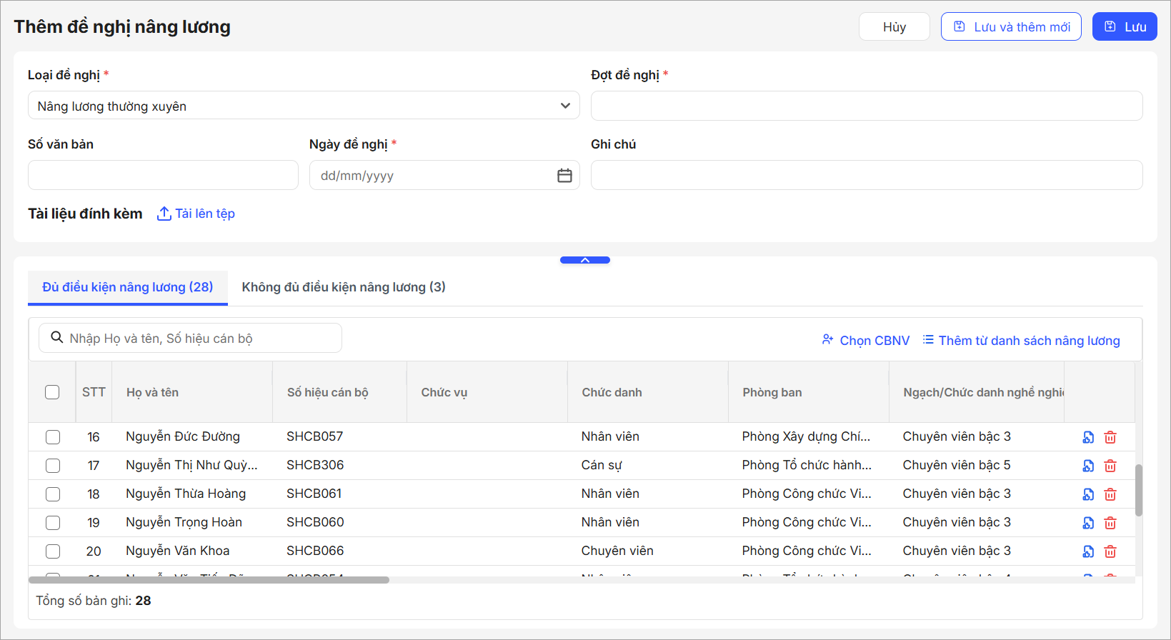 Tại đây, Cán bộ tổ chức có thể theo dõi danh sách tất cả CBNV sắp đến hạn nâng bậc lương, bao gồm cả những người: