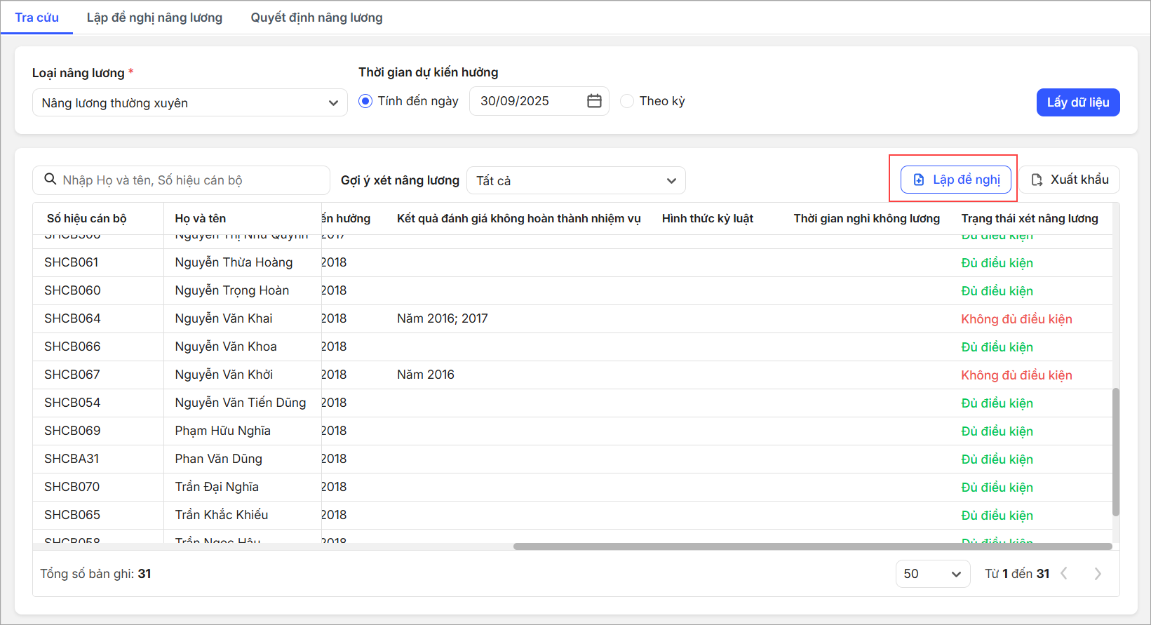 • Nhấn nút Lập đề nghị để tạo phiếu đề nghị nâng lương cho các CBNV vừa được liệt kê.