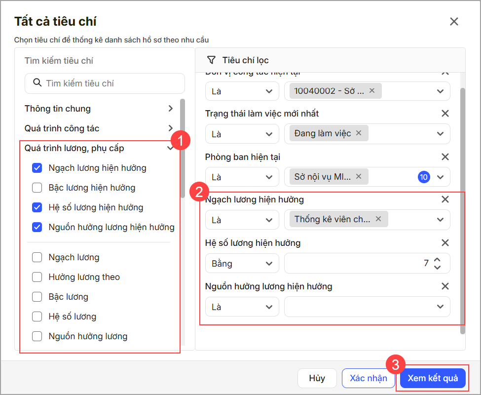 - Anh/chị có thể chọn lọc theo Quá trình lương mới nhất và Hệ số lương hiện tại của từng nhân viên.
