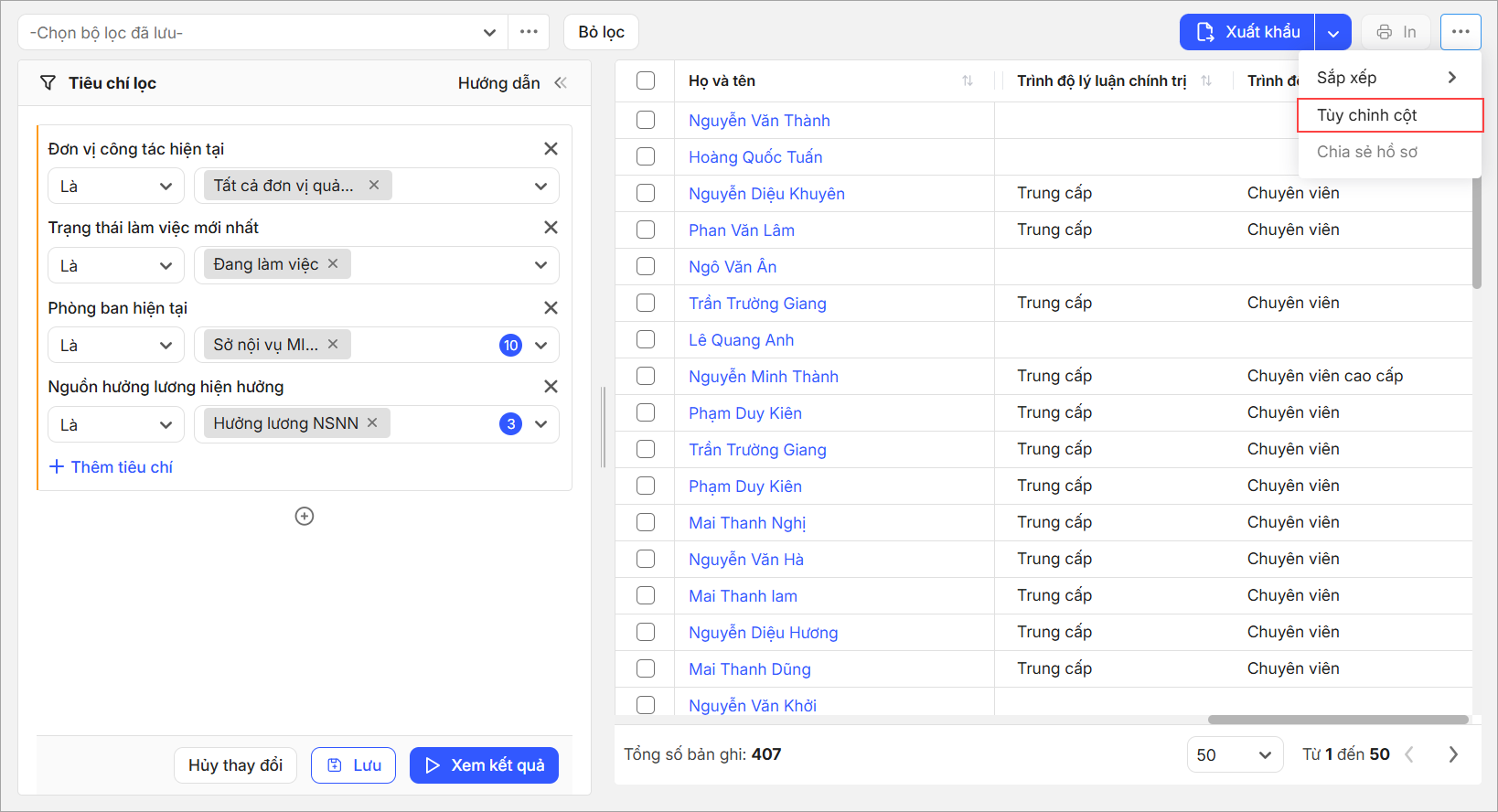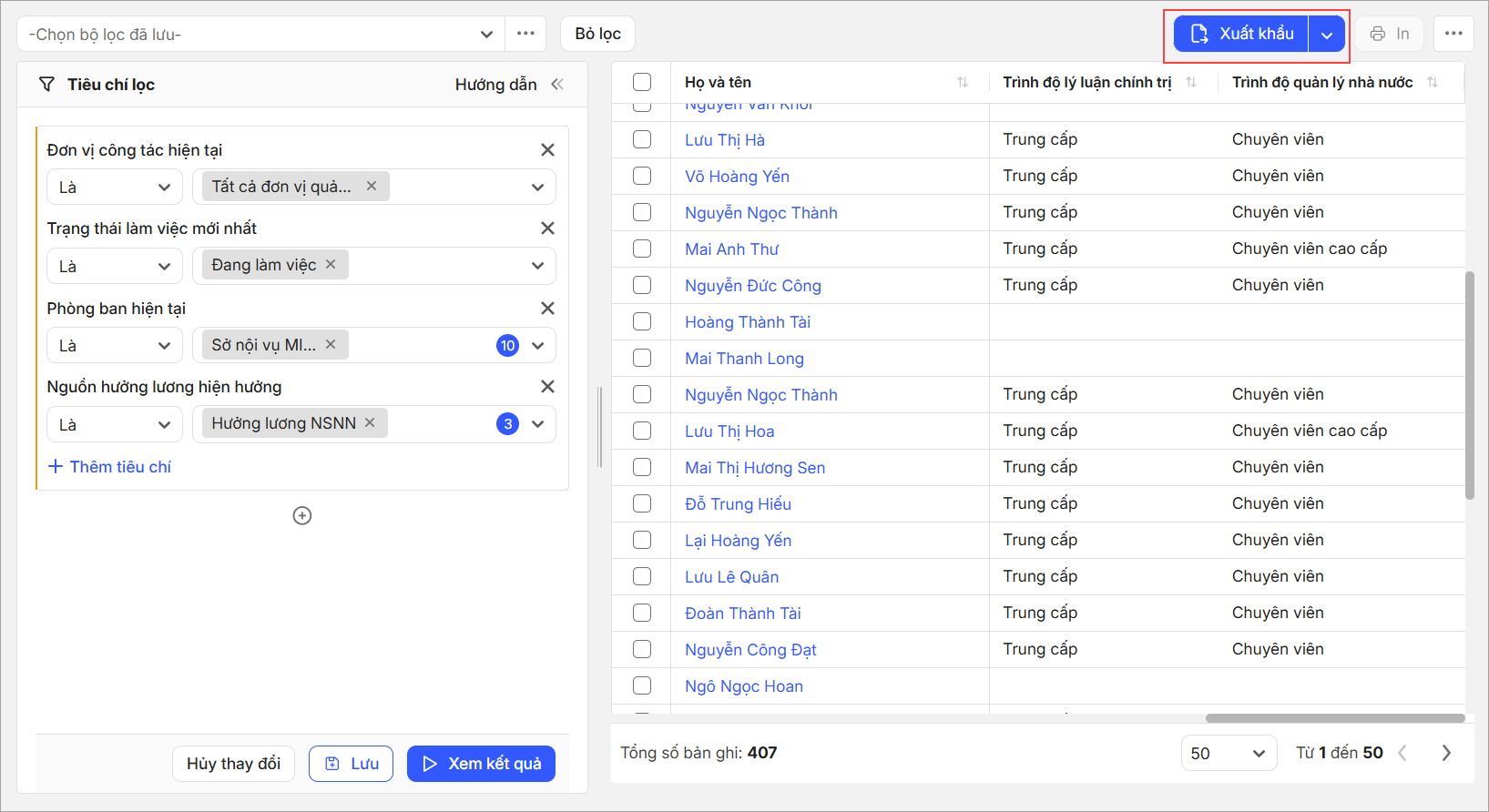 - Anh/chị dễ dàng xuất khẩu danh sách hệ số lương hiện tại của tất cả CBNV để gửi cho kế toán lương đối soát.