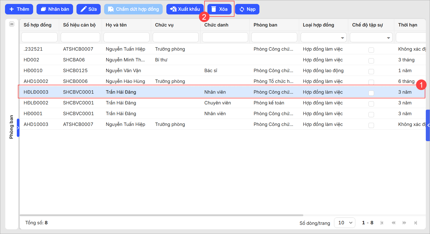 - Chọn hợp đồng của CBCCVC cần xóa trên danh sách, nhấn Xóa.