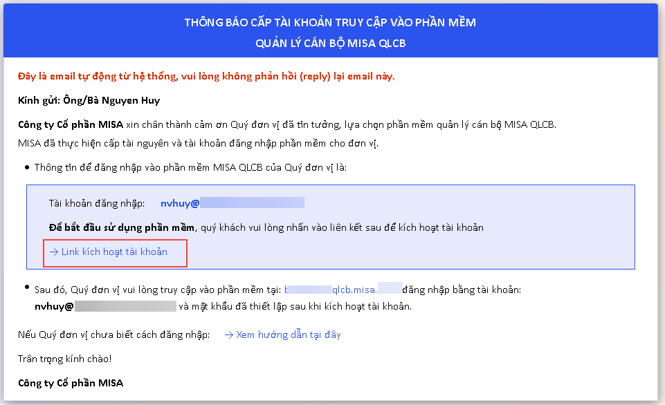 1. Đơn vị nhận được email MISA gửi như sau:2. Nhấn vào đường dẫn Link kích hoạt tài khoản để chuyển sang trang MISA ID kích hoạt tài khoản và thiết lập mật khẩu.