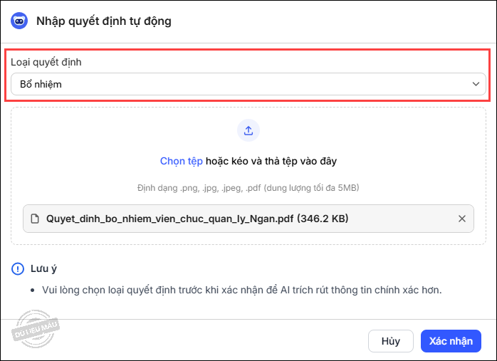 - Tại màn hình Hồ sơ\Hồ sơ CBNV\Quá trình công tác, khi thêm hoặc sửa quá trình công tác, chọn Nhập quyết định tự động, anh/chị lưu ý chọn Loại quyết định để AI trích rút thông tin chính xác hơn.