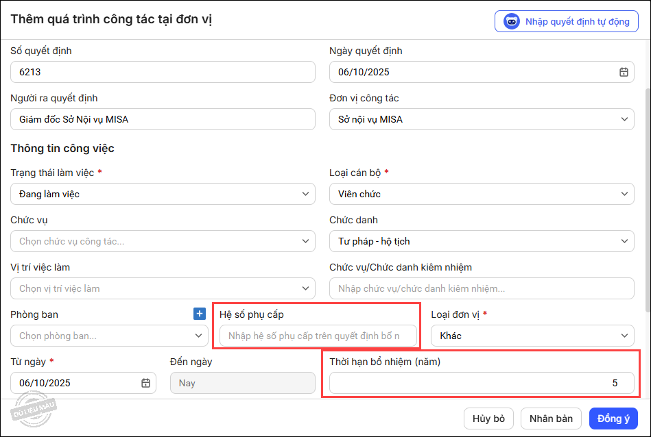 - Tại màn hình khai báo thông tin chi tiết quá trình công tác, phần mềm trường thông tin: Hệ số phụ cấp và Thời hạn bổ nhiệm (năm).