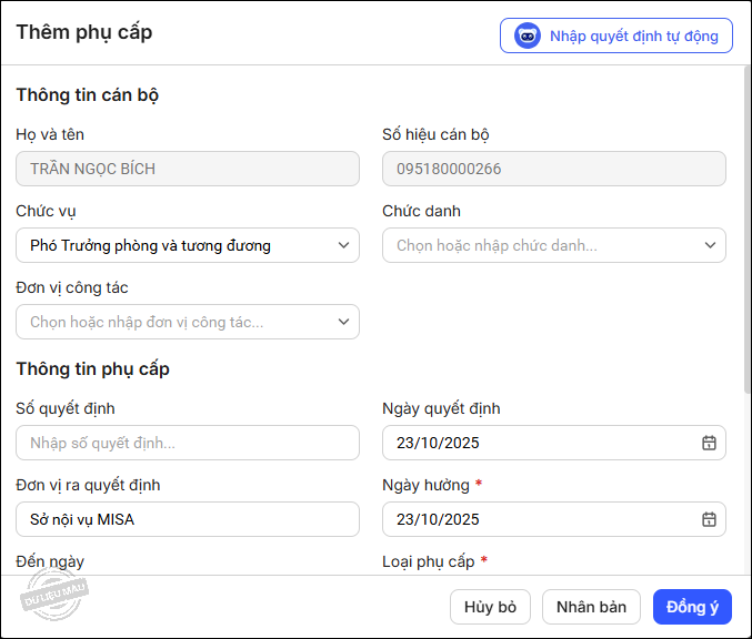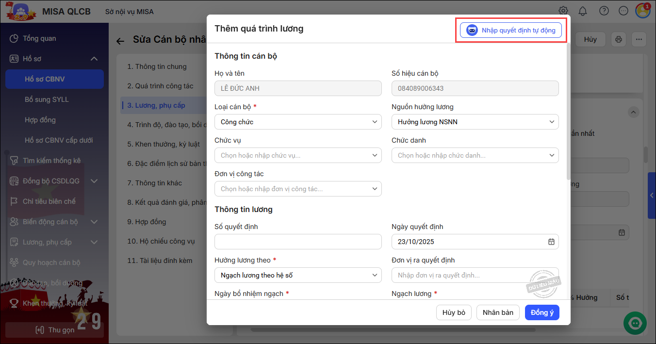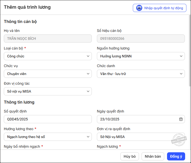 – Chương trình tự động lấy lên các thông tin từ file quyết định. Anh/chị bổ sung thêm các thông tin khác nếu cần. Nhấn Đồng ý.