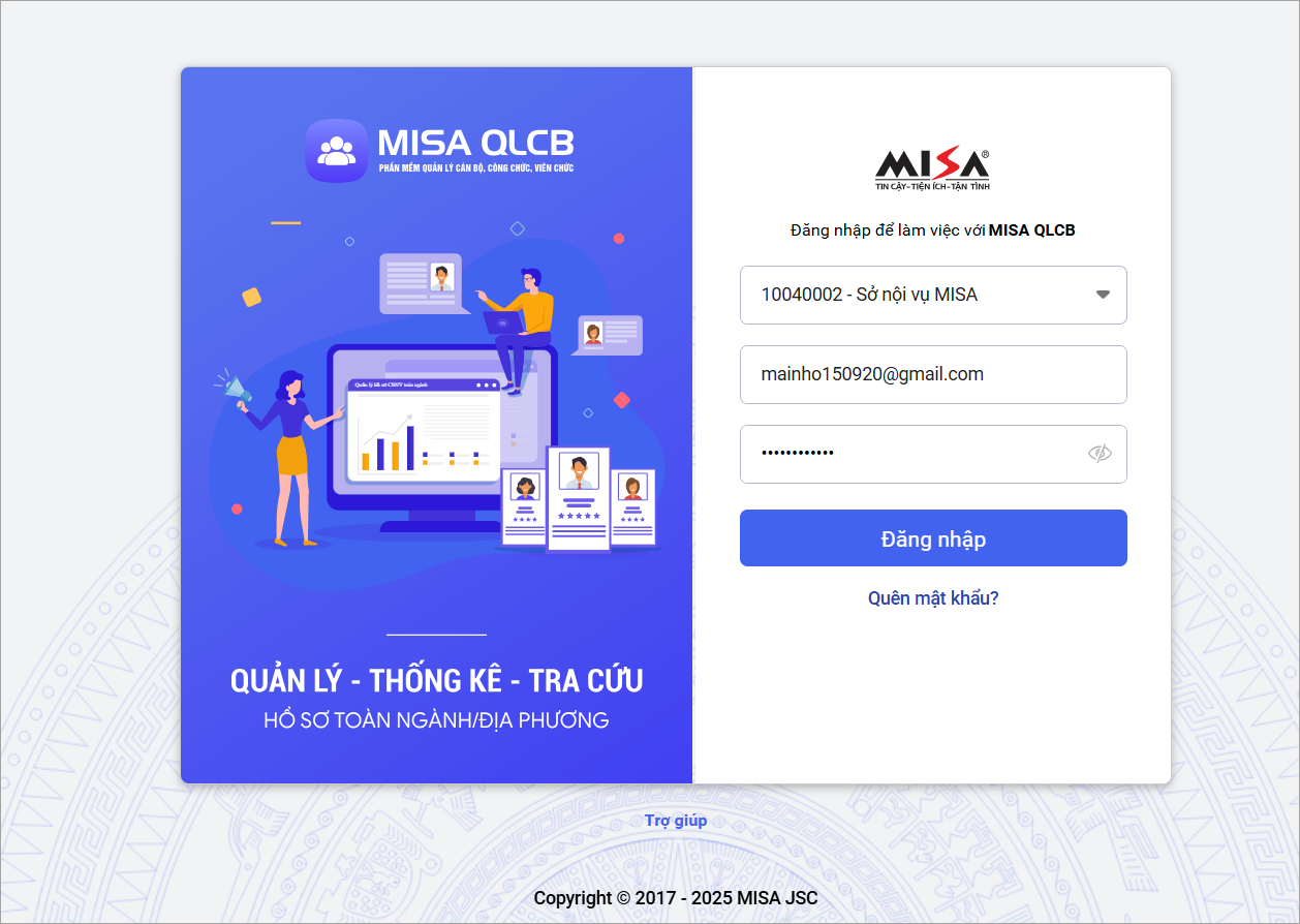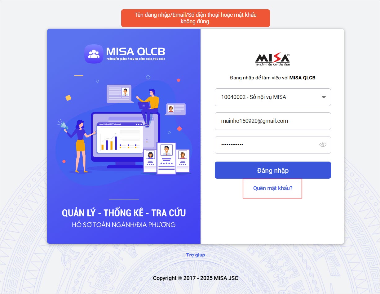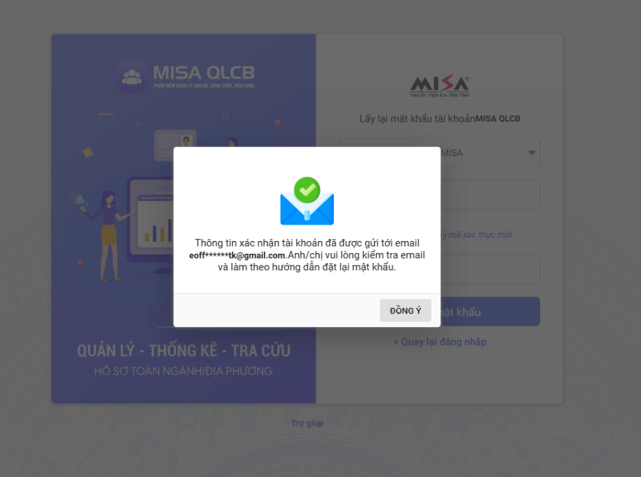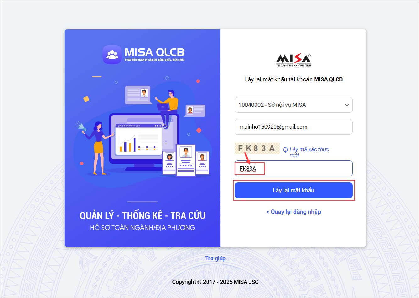 Mục đích: Giúp người dùng lấy lại mật khẩu và đăng nhập vào MISA QLCB trong trường hợp quên mật khẩu.