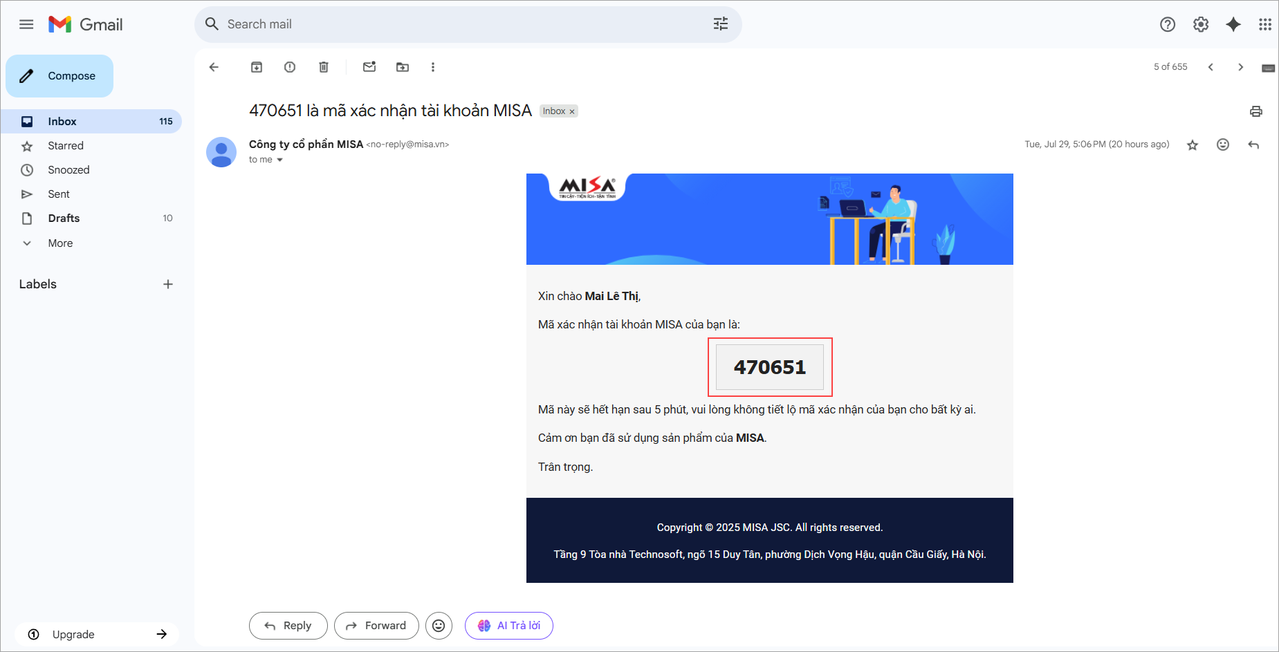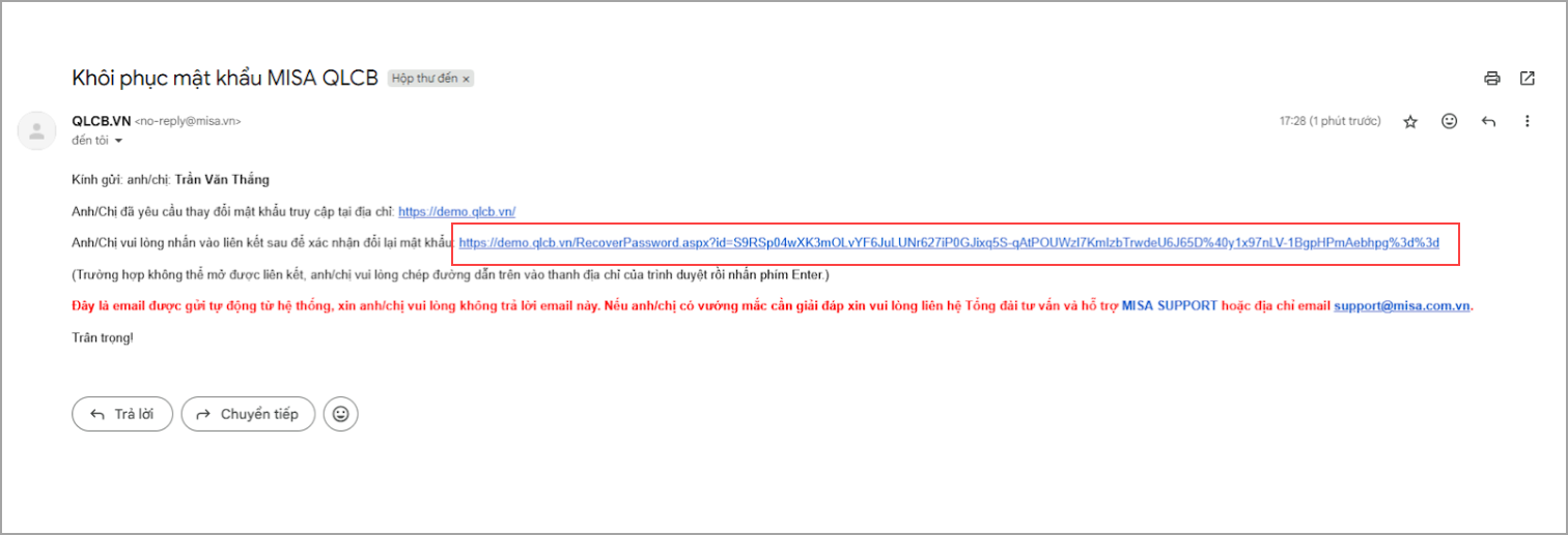 - Anh/chị kiểm tra tài khoản email đã khai báo khi tạo tài khoản để nhận hướng dẫn đặt lại mật khẩu.