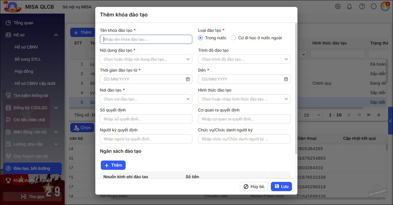 1. Tại màn hình Đào tạo, bồi dưỡng, Khi Thêm hoặc Sửa khóa đào tạo, phần mềm loại bỏ 1 số thông tin không cần thiết: