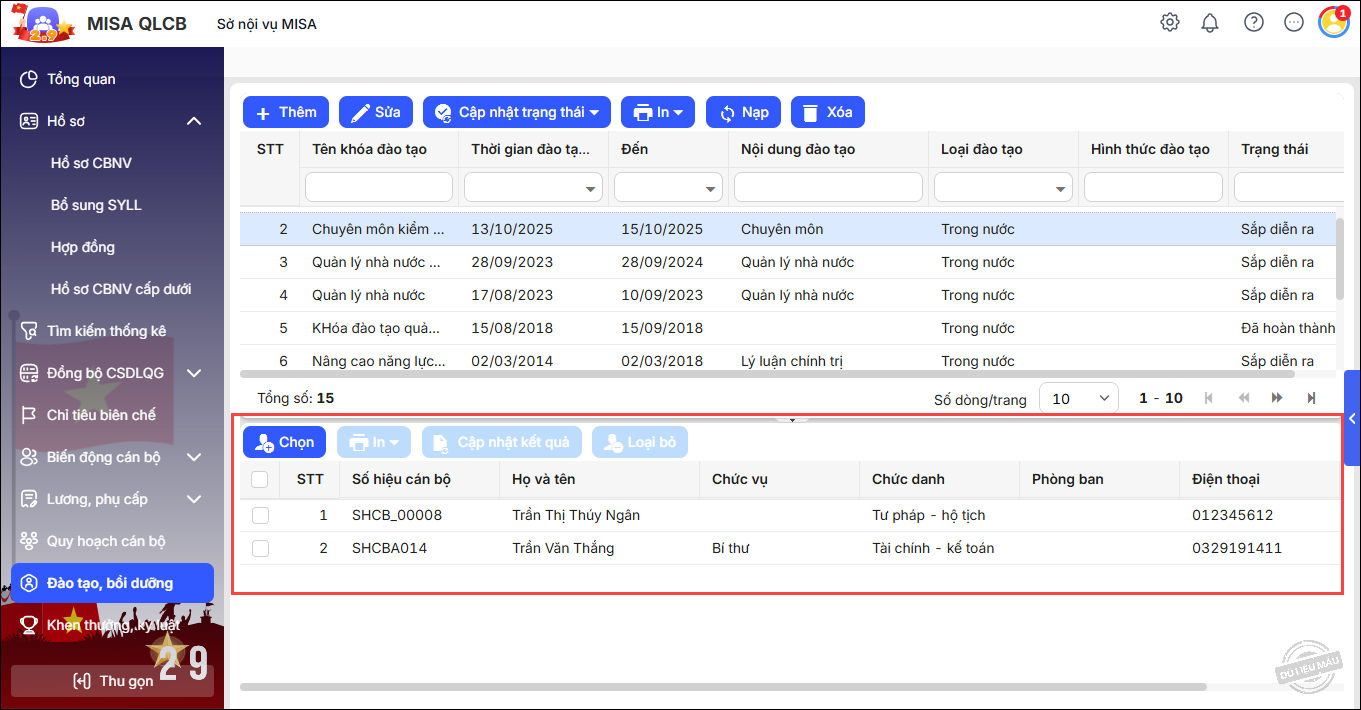 – Kể từ phiên bản R112: Phần mềm đáp ứng chỉ lập danh sách CBNV tham gia khóa đào tạo, bồi dưỡng, bỏ thông tin xác nhận tham gia để tiết kiệm thời gian cho cán bộ tổ chức.