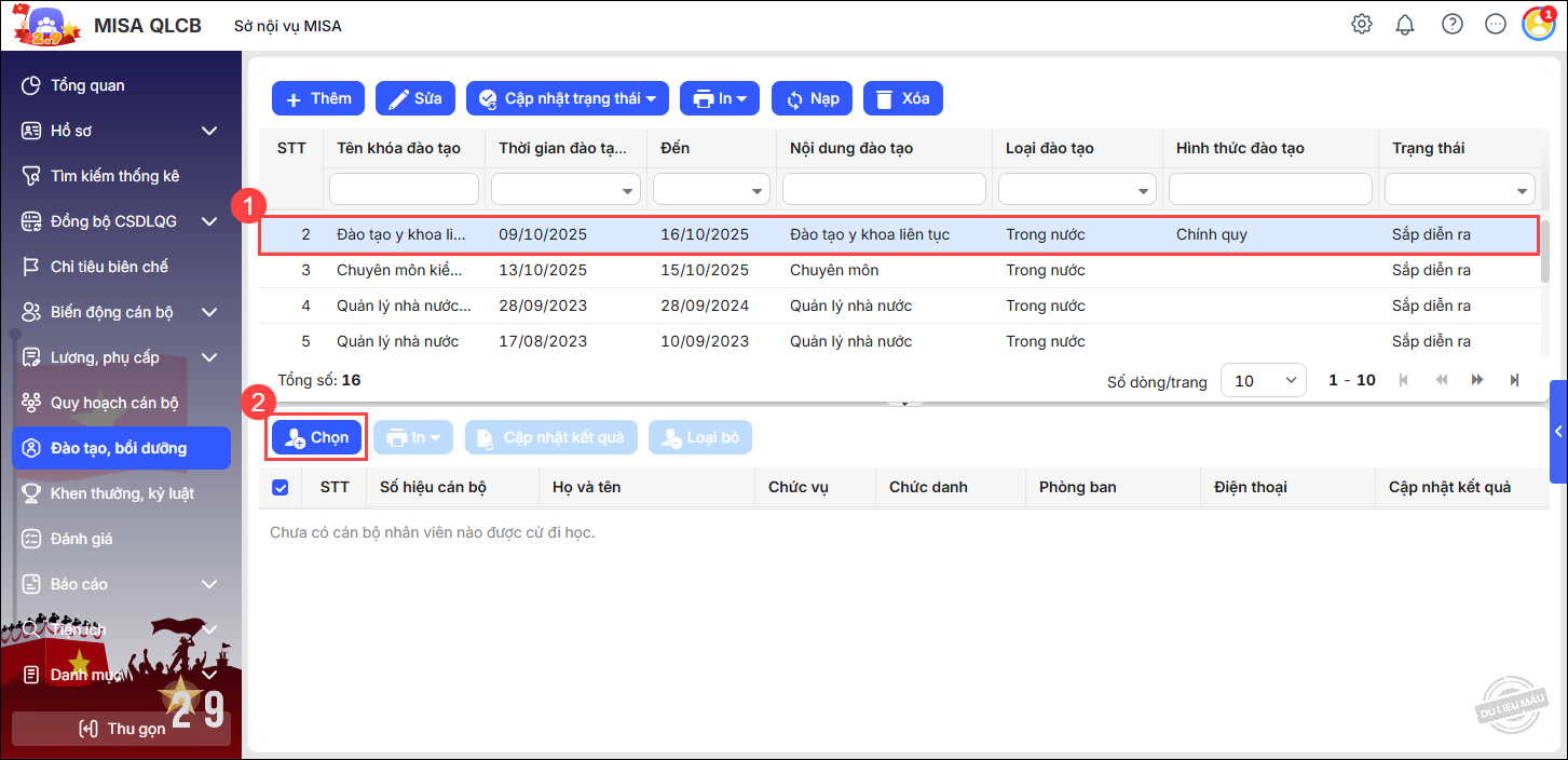 1. Chọn vào khóa đào tạo, bồi dưỡng cần cử CBNV tham gia, nhấn Chọn.