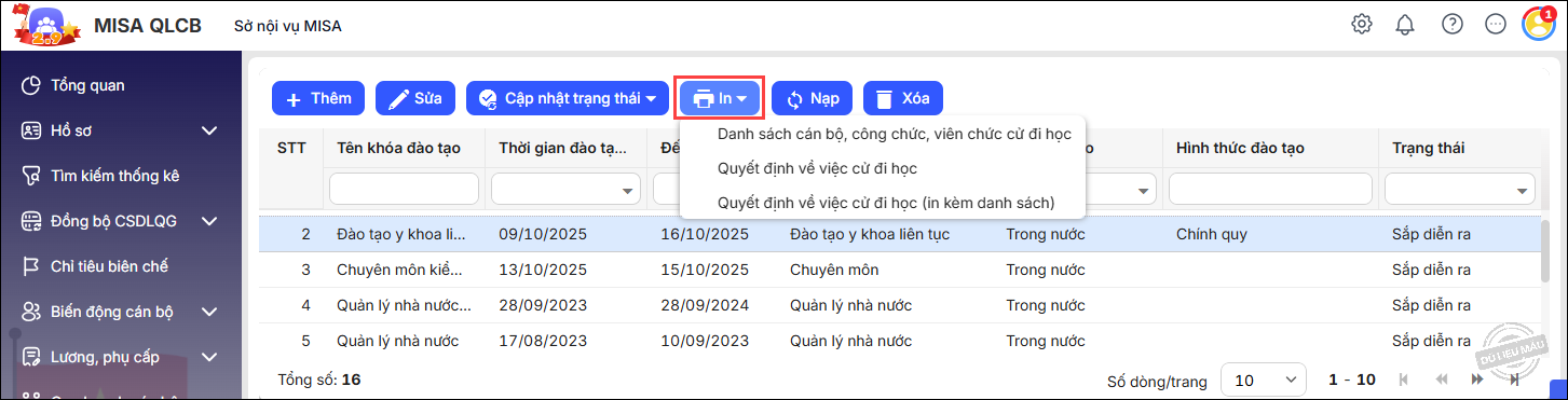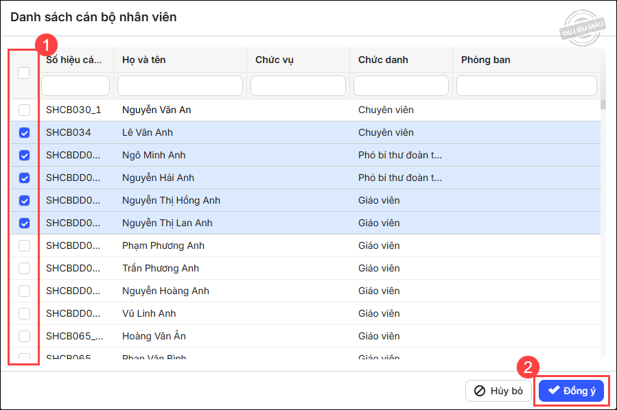 2. Tích chọn các cán bộ nhân viên được cử đi học, nhấn Đồng ý.