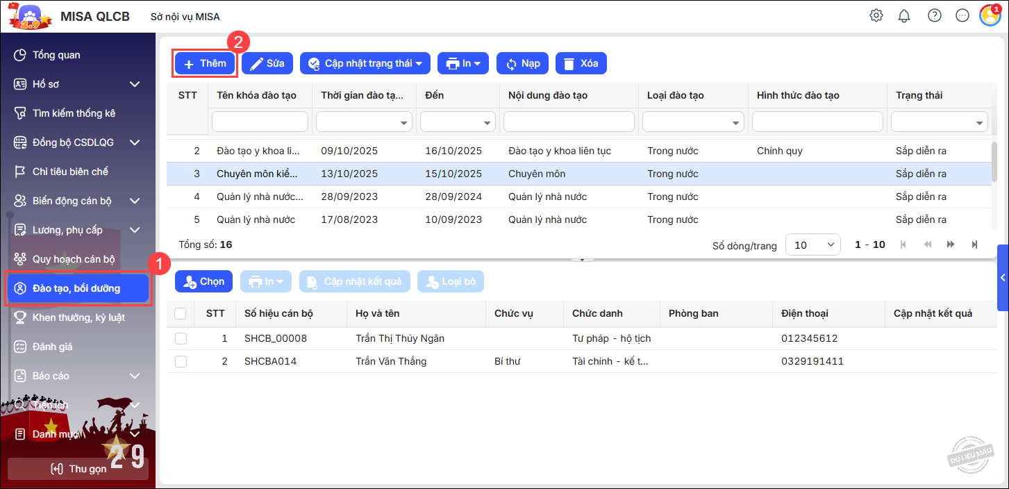 1. Chọn menu Đào tạo, bồi dưỡng\Thêm.