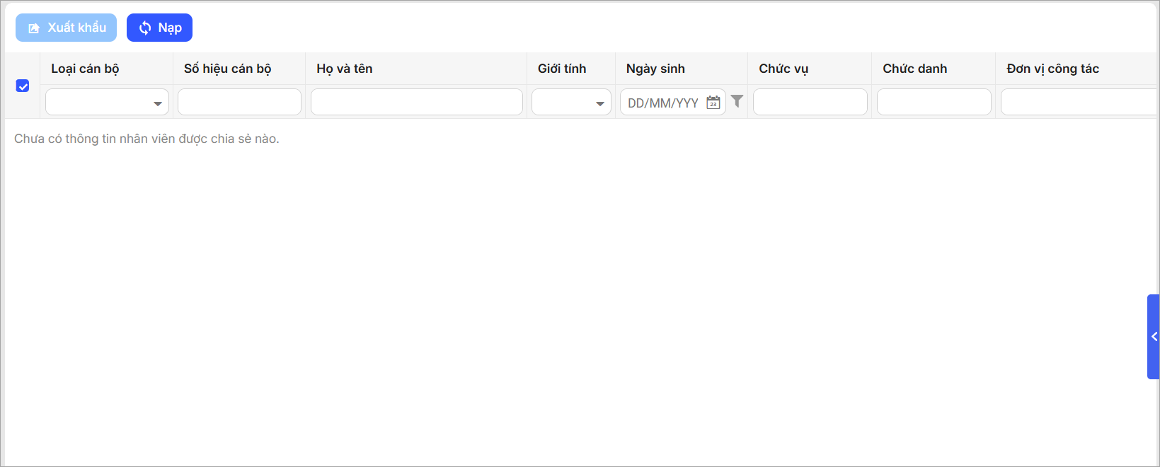 1. Vào menu Tiện ích\Hồ sơ được chia sẻ, phần mềm sẽ hiển thị danh sách hồ sơ CBNV được đơn vị khác chia sẻ2. Có thể nhấn Xuất khẩu để xuất khẩu danh sách hồ sơ được chia sẻ ra file excel.