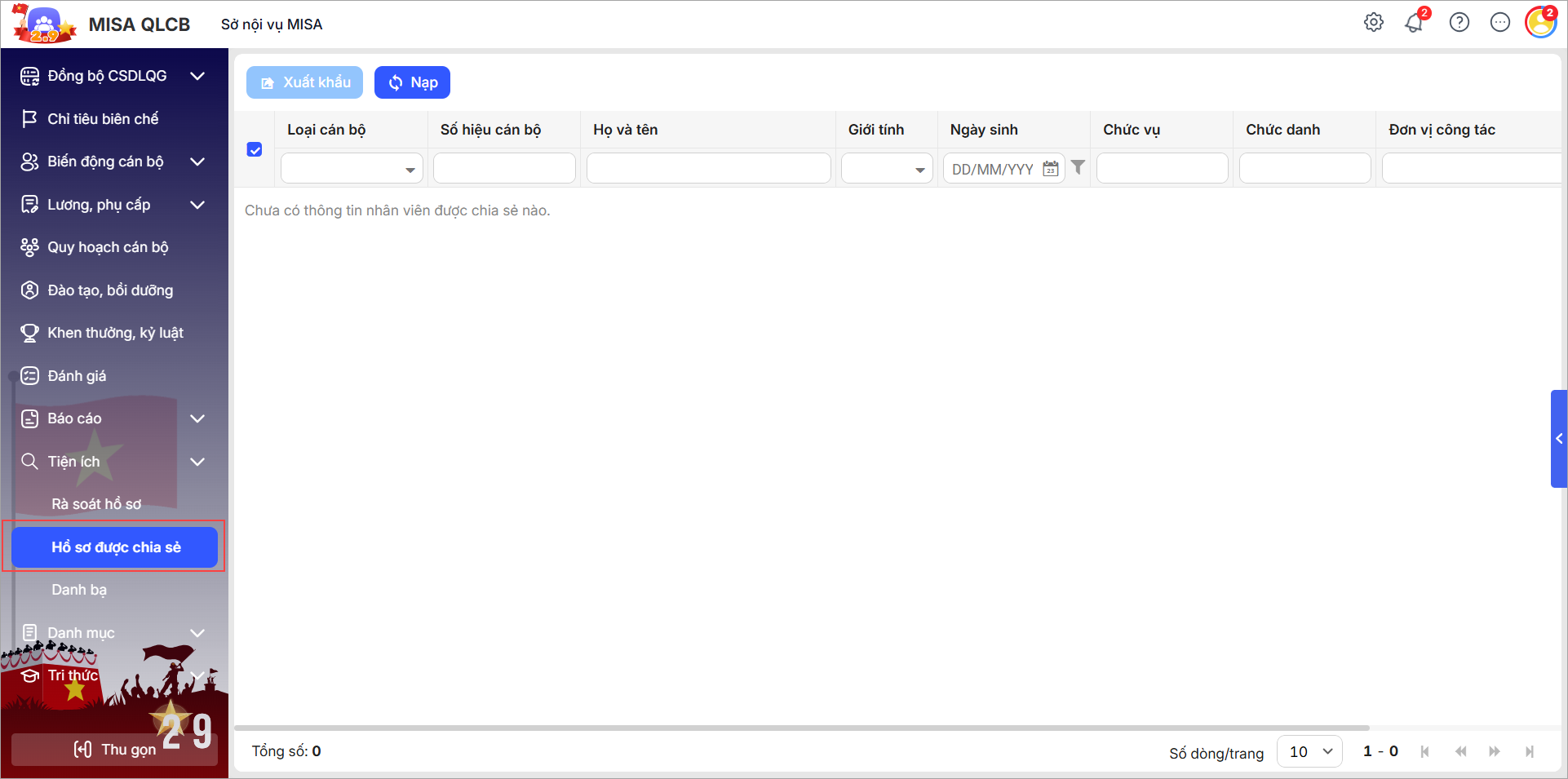 1. Vào menu Tiện ích\Hồ sơ được chia sẻ, phần mềm sẽ hiển thị danh sách hồ sơ CBNV được đơn vị khác chia sẻ2. Có thể nhấn Xuất khẩu để xuất khẩu danh sách hồ sơ được chia sẻ ra file excel.