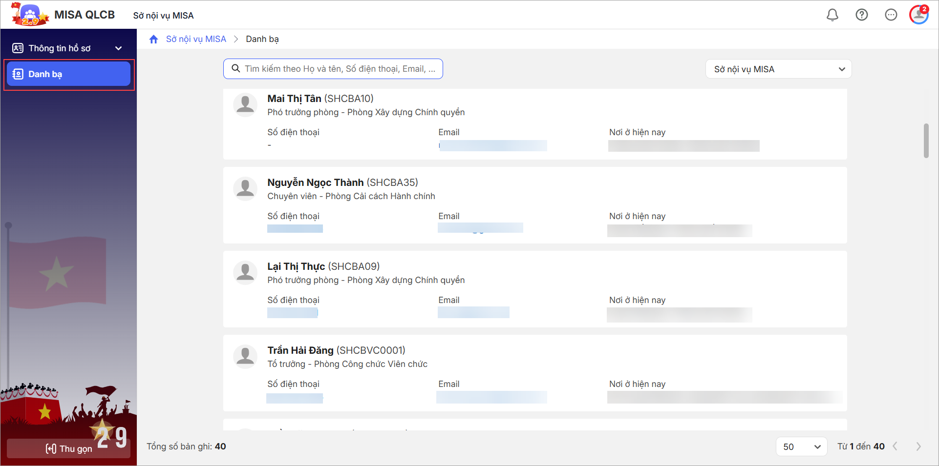 • Tại phần Danh bạ, CBNV có thể nhìn thấy tất cả các thông tin của CBNV khác trong đơn vị để có thể liên lạc khi cần.