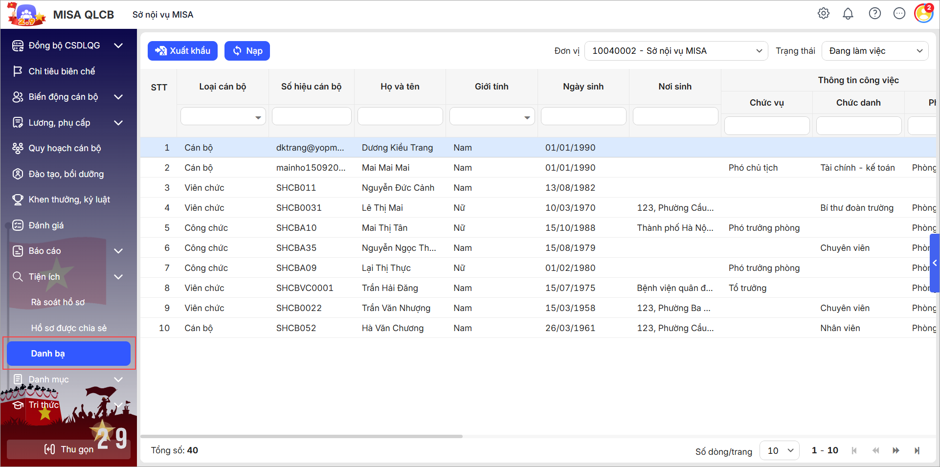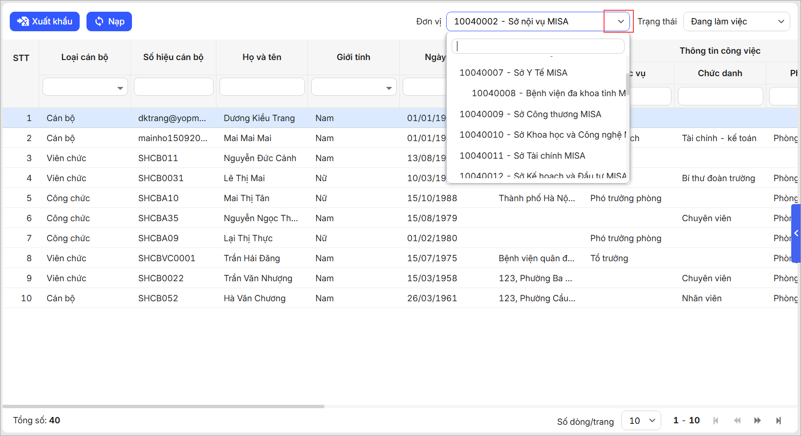 • Anh/chị có thể lọc nhanh các điều kiện tìm kiếm theo Đơn vị, Loại cán bộ, Số hiệu cán bộ, Họ và tên, Giới tính…